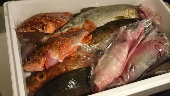 あいにくの天気です...モツビストロなのに魚 入荷しました!五島列島の天然の魚さん達です! クエ、真鯛、黒鯛、イラ、鬼カサゴ、イサキ、カンパチ、メジナ、さば…!!