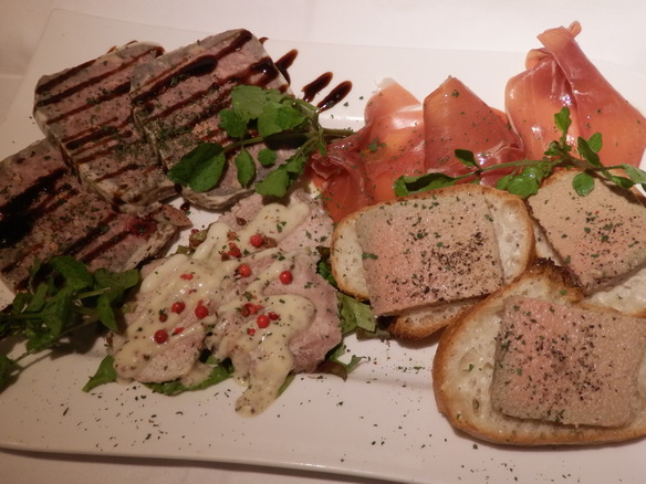 コースのスタートはコレ!鶏レバーのムースやパテ・ド・カンパーニュ、茹でタンなど美味しいお肉が満載!ワインとの相性もぴったり♪